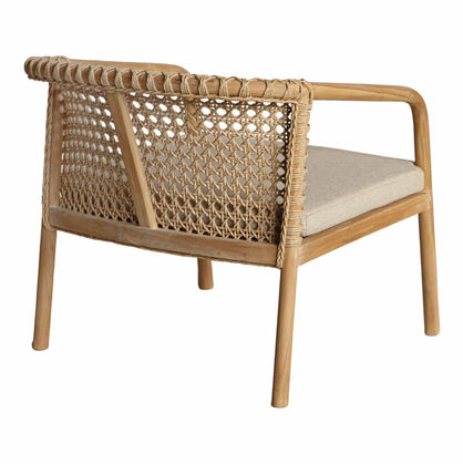Our Antibes Occasional Chair is crafted from plantation teak wood wood, the chair's frame showcases the natural beauty of the wood's grain while maintaining a sleek and sophisticated appearance. The back is covered in a poly hyacinth with creative pattern webbing, making it a unique stylish piece of furniture.