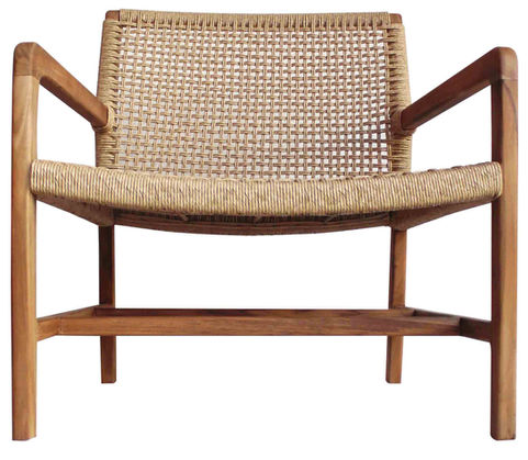 Our Porto Occasional Chair is crafted from plantation teak wood wood, the chair's frame showcases the natural beauty of the wood's grain while maintaining a sleek and sophisticated appearance. The back is covered in a poly hyacinth with creative pattern webbing, making it a unique stylish piece of furniture.