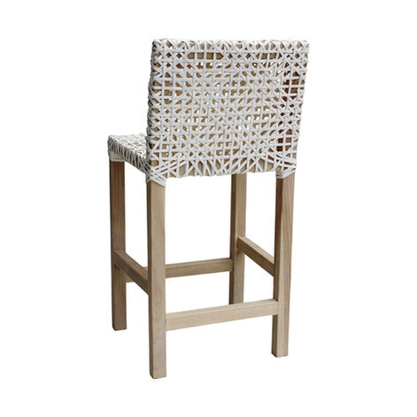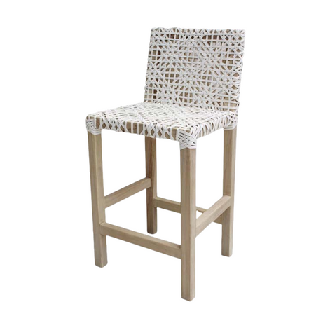 Crafted from solid teak with a natural finish, this counter stool brings artisanal detail and modern elegance to the bar or kitchen. The seat and back are hand-woven in supple white leather straps, forming an intricate geometric pattern that blends comfort with striking visual texture. Elevated on a sturdy teak frame with a built-in footrest, it offers both durability and style, making it an ideal choice for contemporary or coastal-inspired spaces.