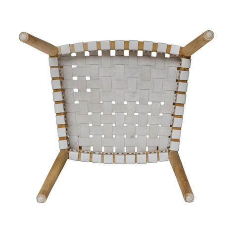 Crafted with a teakwood frame and a woven seat of white leather, the Eijnar Dining Chair offers a balance of durability and quiet elegance. Its airy design and soft tones make it an inviting addition to any dining space.