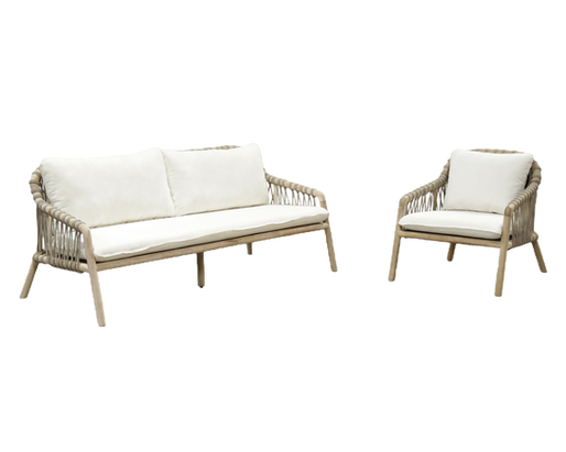 The Malibu Outdoor Sofa blends coastal texture with modern relaxation. Its plantation teak frame—finished in a reclaimed, weathered tone—creates a warm, grounded silhouette. Taupe 8mm outdoor rope is handwoven in a V-cross pattern, adding sculptural detailing and open, airy texture. A supportive Sunproof Greystoner sling forms the seat base, topped with a plush Copacobana cushion for laid-back comfort. With deep seating and a tailored back pillow, Malibu offers a refined take on California-coastal lounging.
