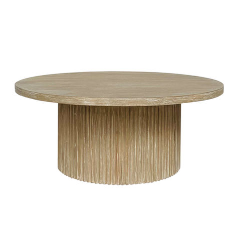 The Elle Coffee Table is crafted from mindi wood, its round silhouette softened by the warmth of natural grain. The round top rests on a base carved with vertical lines, creating gentle texture and rhythm while maintaining a clean, refined look. Timeless and versatile, it brings both elegance and organic character to any living space.