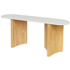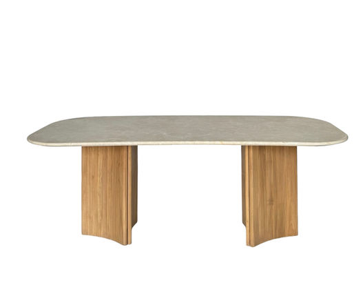 Our Curve Dining Table pairs a polished 89" sandstone top and a sculptural mindi wood base. Its oval surface brings a sense of luxury and timelessness, while the star-like wooden foundation adds warmth and flow through its gently curved panels. Blending organic texture with geometric form, it stands as both a functional table and a statement piece.