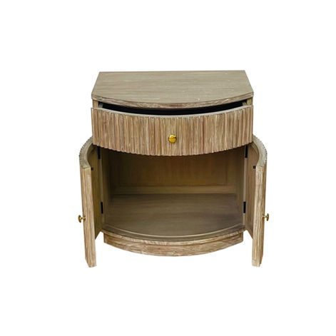 A single top drawer provides quick-access storage, while the two fluted doors below open to reveal a spacious interior compartment—perfect for books, chargers, or bedside essentials.