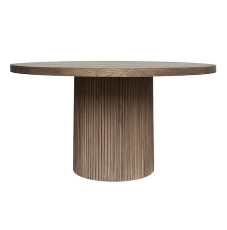 The Elle Dining Table is avaliable in two sizes: 47'' and 60''. Crafted from solid mindi wood in a beautiful satin smoke finsih. The round top rests on a base carved with vertical lines, creating gentle texture and rhythm while maintaining a clean, refined look. It lends timeless elegance to both classic and contemporary interiors.