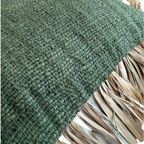 The fabric is a traditional Indonesian textile, Tenun Tumanggal, hand-spun from 100% cotton and woven on manual looms. Each weave carries the subtle irregularities and rhythm of the artisan’s hand, resulting in a natural, textural surface that feels both organic and elevated. One side is softly dyed in a muted moss-green tone, offering depth and calm through its earthy, grounded color.