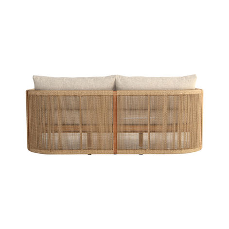 The Solana Sofa brings a refined simplicity to outdoor living, balancing clean architectural lines with tactile woven detail. Its solid teak frame showcases soft edges and a natural, sun-warmed tone, while the handwoven synthetic rattan lends a rope-like texture that softens the structure with artisanal warmth. Generous cushions upholstered in neutral performance fabric invite laid-back lounging with a contemporary edge—perfect for both open-air terraces and covered patios.