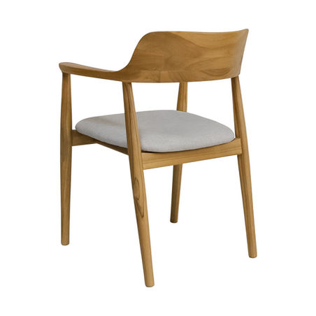 Designed for indoor use, the chair features an upholstered seat in a soft cream fabric with foam cushioning for added comfort. The combination of natural teak and tailored upholstery brings warmth and structure to dining spaces while maintaining a clean, understated presence.