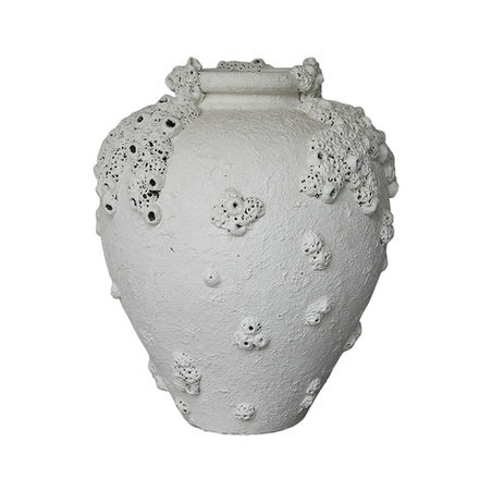 The Barnaca Small Vase is hand-thrown from terracotta and finished with a rough white coating that emphasizes its organic form and surface detail. Each piece is individually shaped and hand-carved, creating raised, barnacle-inspired textures that vary subtly from vase to vase. Because it is handmade, no two pieces are exactly alike, with natural variations in carving, texture, and color contributing to the character of each vase. Designed as a decorative object, this size brings depth and visual interest to a space and is ideal for shelves, smaller consoles, or layered tabletop styling where surface detail can be appreciated up close.