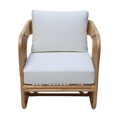 The Capri Occasional Chair blends mid-century lines with natural artistry. Hand-shaped rattan poles form a bold open-frame silhouette, where sculptural curves and layered detailing echo the effortless style of coastal modern living. Its architectural form is softened by plush white cushions in durable polypropylene, balancing organic warmth with contemporary comfort. Like its namesake, Capri evokes relaxed elegance by the sea — a statement piece that feels both timeless and refreshing.