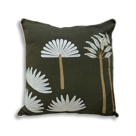 The Cyprus Frond Pillow brings depth and refinement through its bold contrast and sculptural embroidery. Made from a linen blend, it features textured frond motifs in soft white and sand threads set against a rich olive base. The intricate stitching adds quiet dimension, giving the design a tactile presence that feels both grounded and elevated.