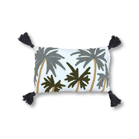 Made from 100% linen, the Vista Palm Lumbar features multi-toned palm embroideryin sage, olive, and stone hues that create natural contrast and dimension. Dark tassels at each corner complete the design with a refined, textural finish. Comes with a polyester insert and a hidden zipper for easy removal and cleaning.