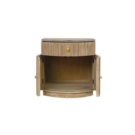 A single top drawer provides quick-access storage, while the two fluted doors below open to reveal a spacious interior compartment—perfect for books, chargers, or bedside essentials.