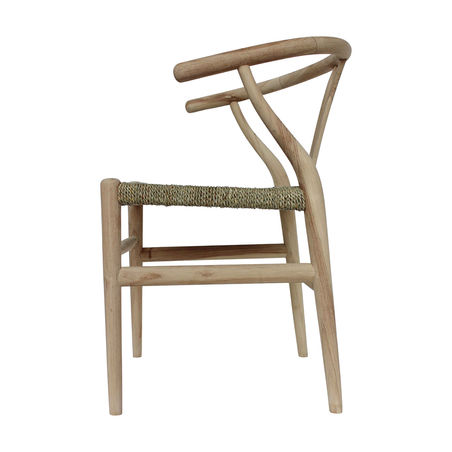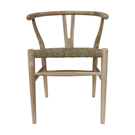 The Hans Dining Chair showcases a graceful teak frame with a handwoven seagrass seat. Its sculptural curved back and airy silhouette create a design that’s both comfortable and timeless.