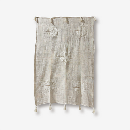 Cream palm motifs are embroidered across the surface, offering a subtle, tonal look that blends seamlessly with the woven base. The palms have a soft, brushed texture that adds gentle depth while keeping the overall palette light and airy. Finished with tassels at the top and bottom, the throw drapes beautifully across a bed, sofa, or favorite reading spot.