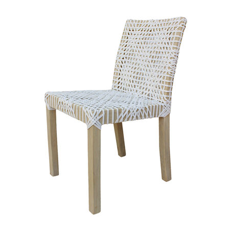 This modern dining chair combines the warmth of natural teak with the sophistication of white leather. The solid teak frame is left in a natural finish, highlighting the wood’s organic grain and durability. The seat and back are hand-woven in supple white leather straps, creating a striking geometric pattern that balances comfort with visual intrigue. Light yet sturdy, it’s a versatile piece that fits seamlessly into both contemporary and coastal-inspired interiors.