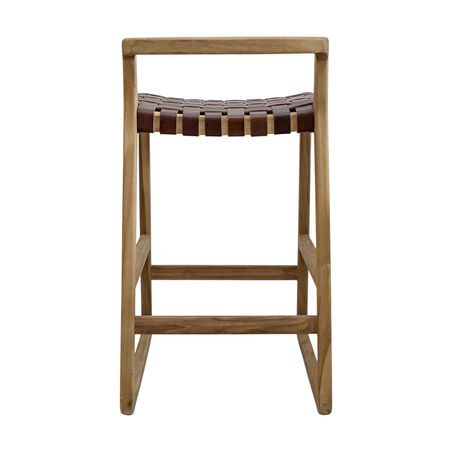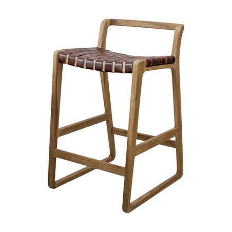 The Manu Counter Stool pairs a clean-lined teakwood frame with a handwoven seat of brown cow leather straps. The natural warmth of the teak contrasts beautifully with the crisp leather, creating a look that is both modern and timeless. Sturdy yet refined, this stool offers lasting comfort with its supportive weave and gently curved backrest. Perfect for kitchen islands, counters, or casual dining spaces, it brings a sophisticated edge to everyday seating.