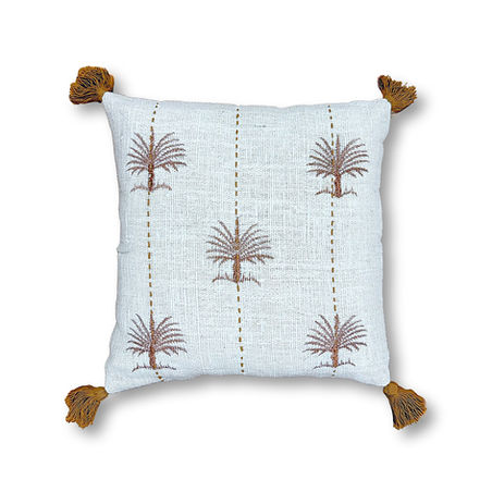 Embroidered with small palm motifs in warm neutral threads, the design offers a balanced blend of texture and pattern. Golden brown tassels at each corner complete the look with a subtle artisan touch. Finished with a polyester insert and a hidden zipper for ease of care and versatility.