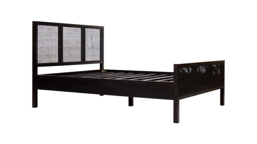 The Wright Bed, available in King or Queen, is crafted from solid mango wood and natural rattan, finished in a sleek black for a modern, clean-lined look.