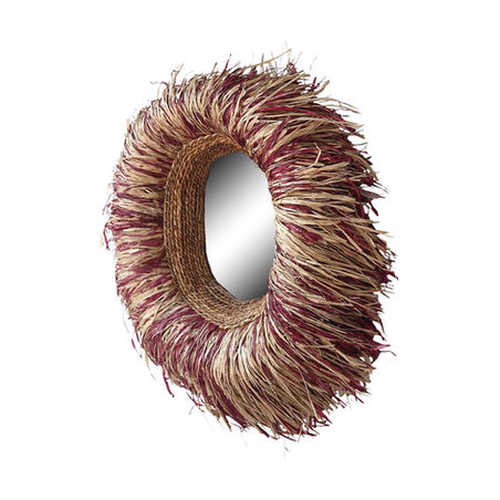 Handcrafted from woven banana fibre and finished with a dramatic halo of natural and dyed sisal, this mirror adds bold texture and vibrant energy to any space. The layered fibres, with their striking mix of earthy neutrals and deep red tones, create a sunburst-inspired silhouette that feels both organic and tribal-chic. A true statement piece, it brings artisanal craftsmanship and global flair to entryways, living rooms, or bedrooms.